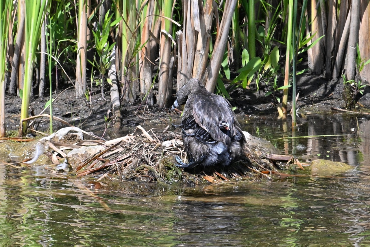 Pied-billed Grebe, Ottawa, by Gillian Wright. Gillian watched this family over a couple of weeks (from an appropriate distance). She watched them lay about 10 eggs, chicks hatch, a mink take a couple of chicks, and finally the adults give up on the nest with the six surviving chicks. The adults built 2 more nests but did not lay any more eggs. This is the original nest. The adult male arrived at the nest with 4 chicks on its back, but they fell off as it waddled up. Note how far back the legs are situated on this bird, leading to the species’ awkwardness on land. #YouCanAtlasThat