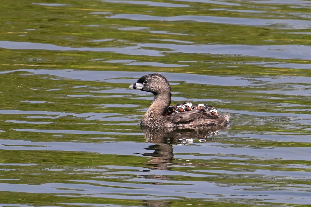 Pied-billed Grebe, Ottawa, by Gillian Wright. Adult male with 6 chicks on his back (5 showing). Unlike most ducks where the female does all the work, grebes raise chicks as a team.