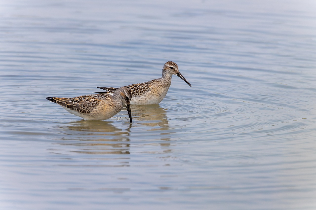 Stilt Sandpipers, Carleton Place storm pond, by Maureen Mark. The almost completely submerged head is typical of this species. Spend time watching shorebirds and the way they separate themselves into niches (of water depth) to exploit their variety of bill and leg shapes and lengths. It eventually becomes possible to id many distant birds by behavior.